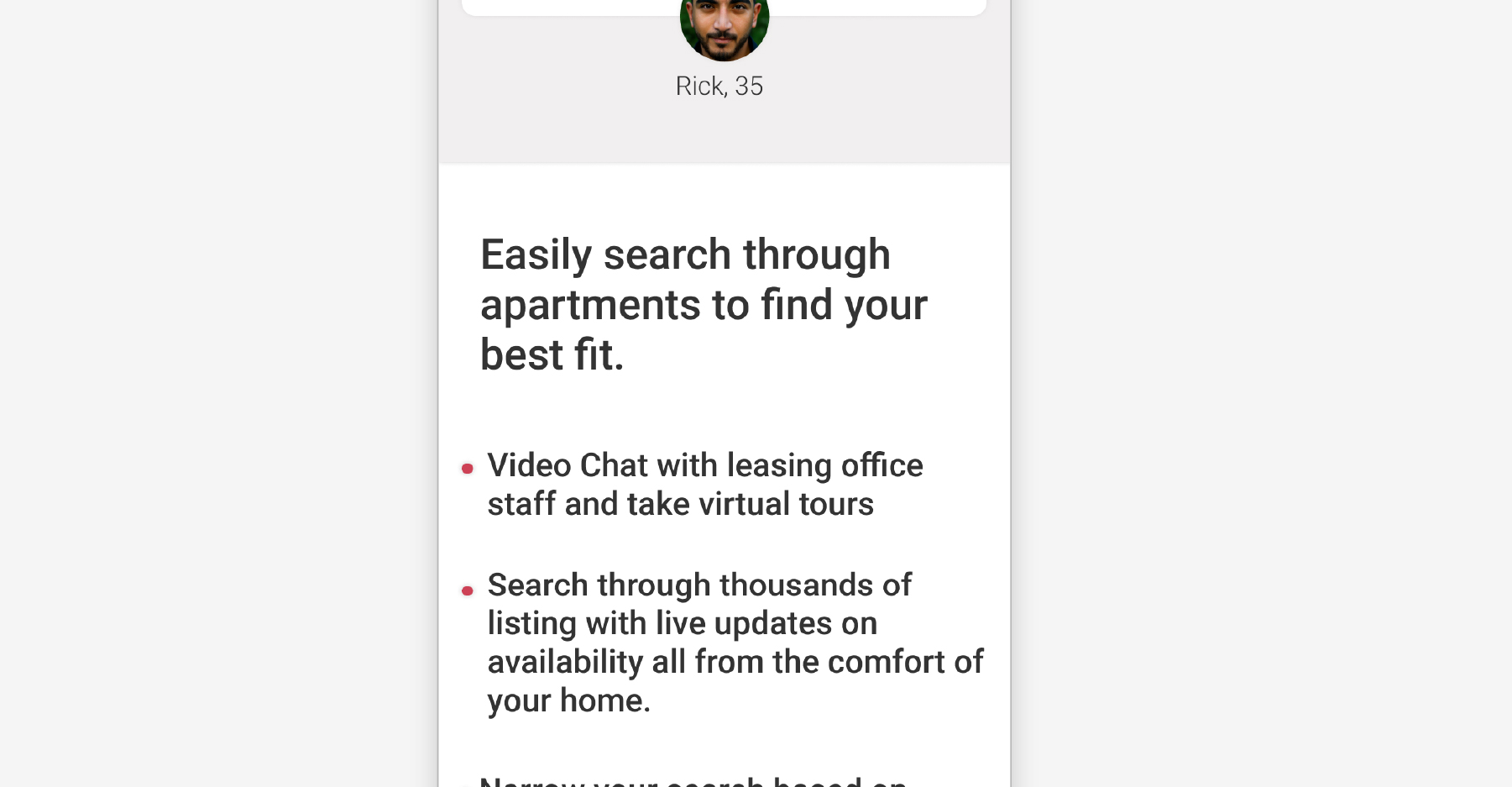 A user wants to search for an apartment in a specific area, refine the results by a set of criteria, view the details about an apartment, and initiate contact with the owner.