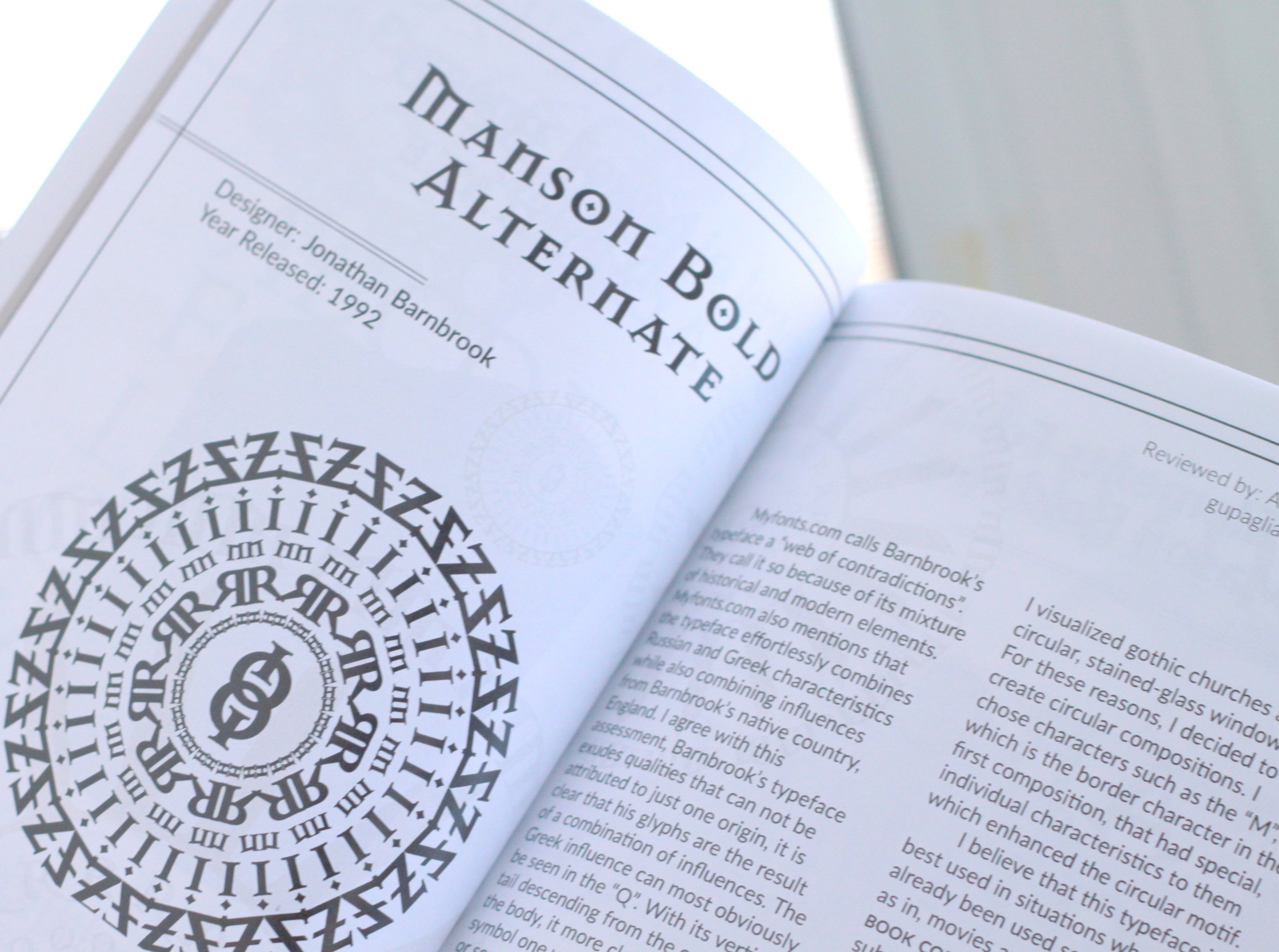 A 105 page bound book encompassed with four-page spreads for each typeface. Each spread starts with a stone that previews the look and feel of each typeface, leaving the next three pages as a reference that details the makeup of each typeface.